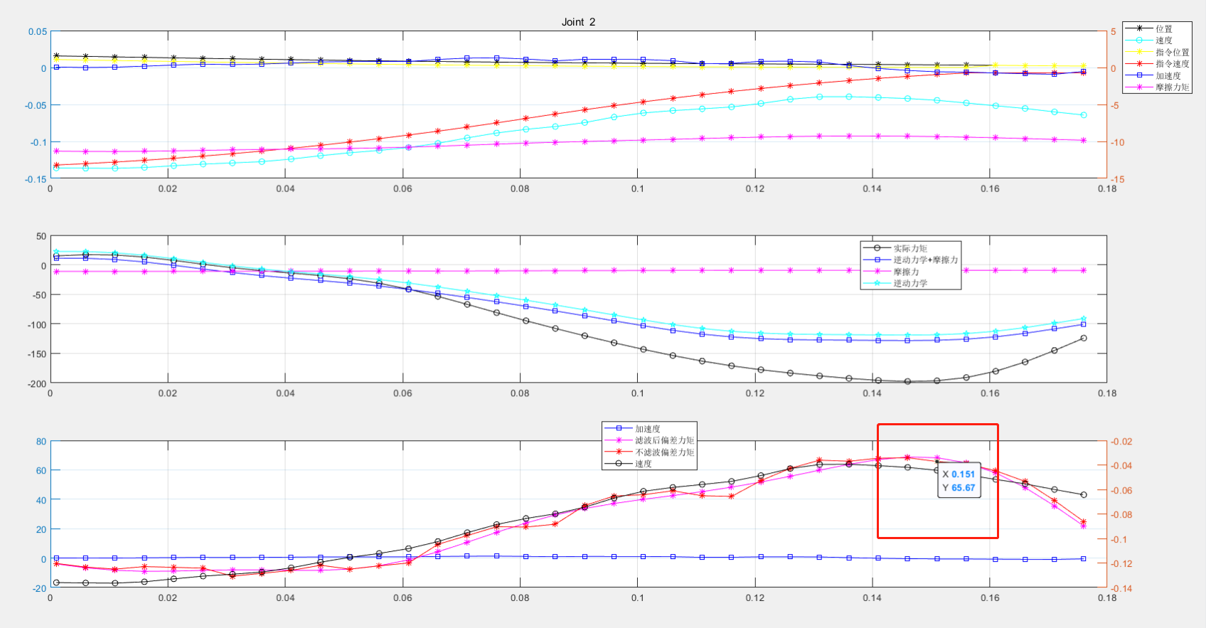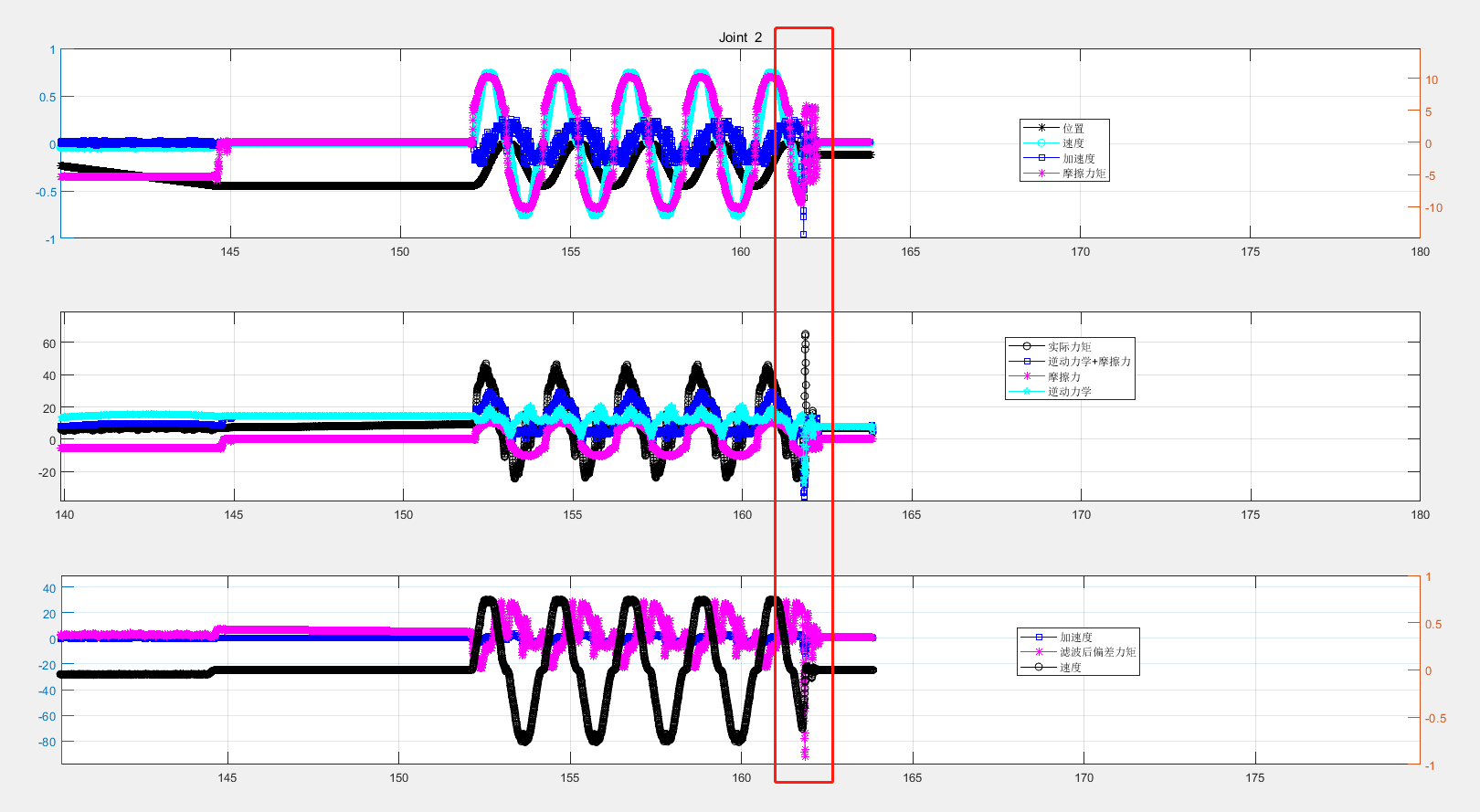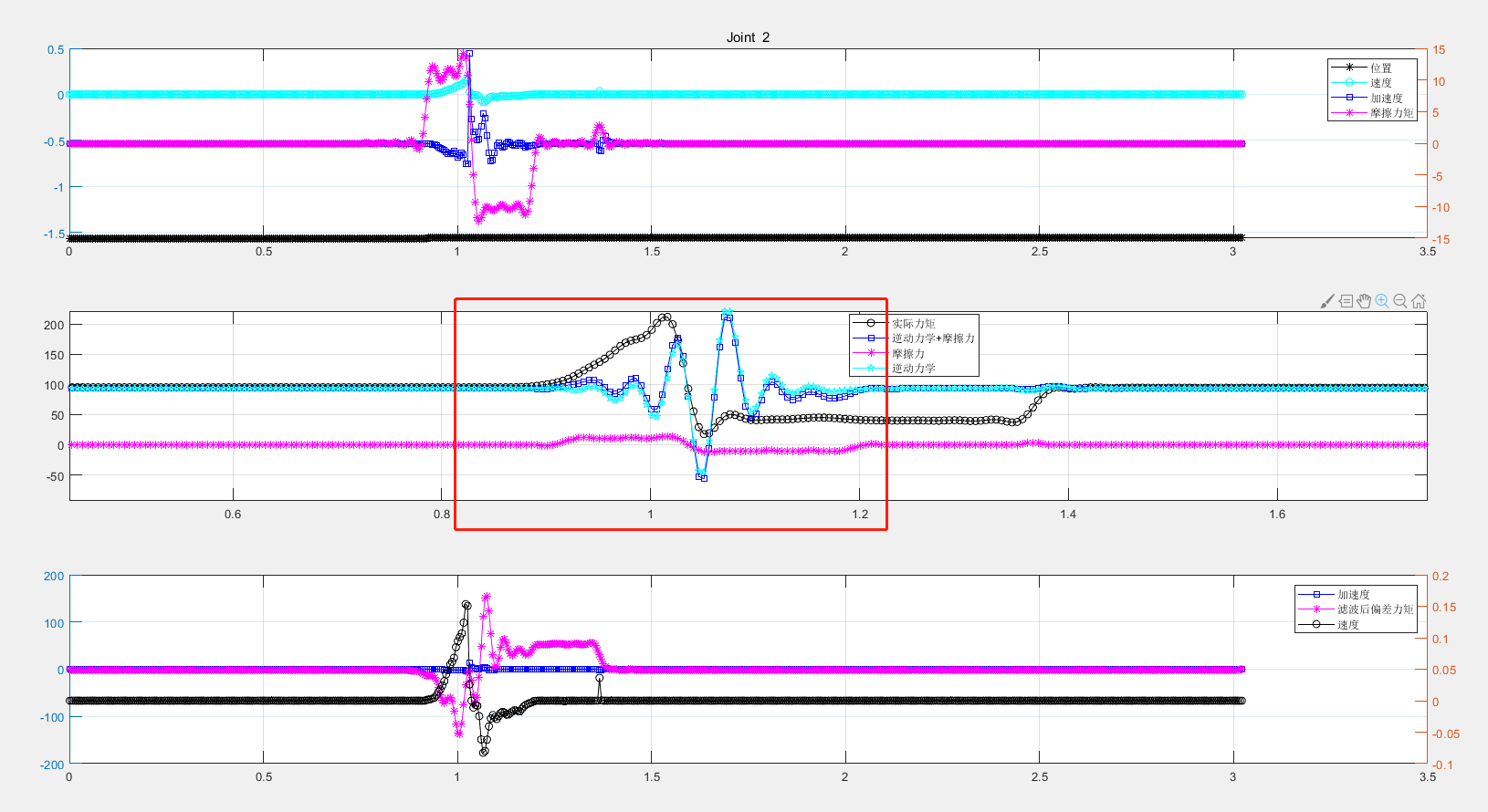 2)摩擦力矩偏小,摩擦参数存在误差;3)速度与加速度滤波导致延迟太大,实际力矩与理论力矩明显不同步导致偏差力矩过大