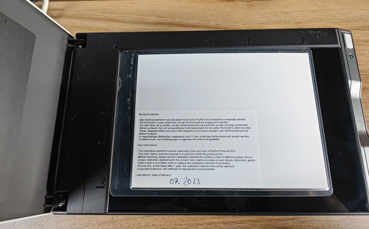 (3)碰撞后等待c膜显色,显色完成后,先将该膜置于扫描仪上,然后将gte校准表(背景板)如下图所示覆盖于之上。然后点击软件中Coba Scan按钮(参考图9上方位置)进行扫描,扫描后可得到压力分布图像。