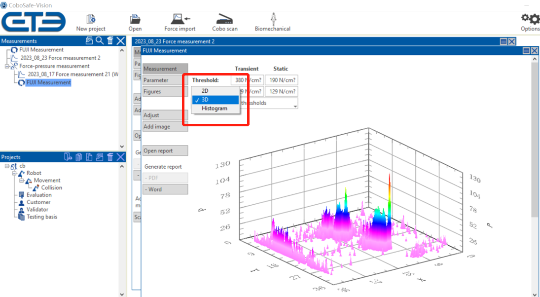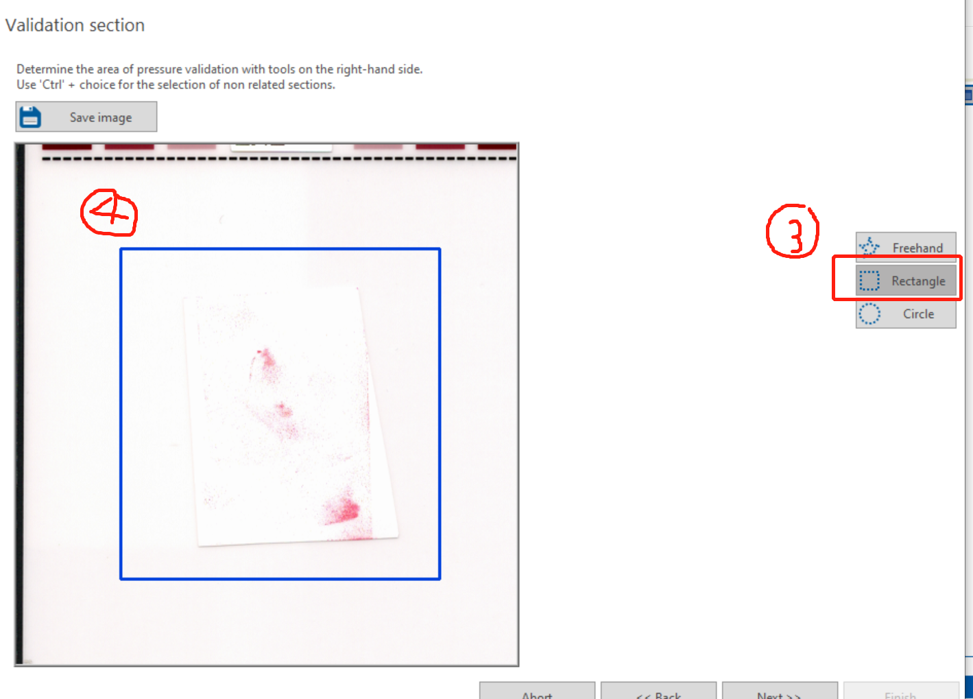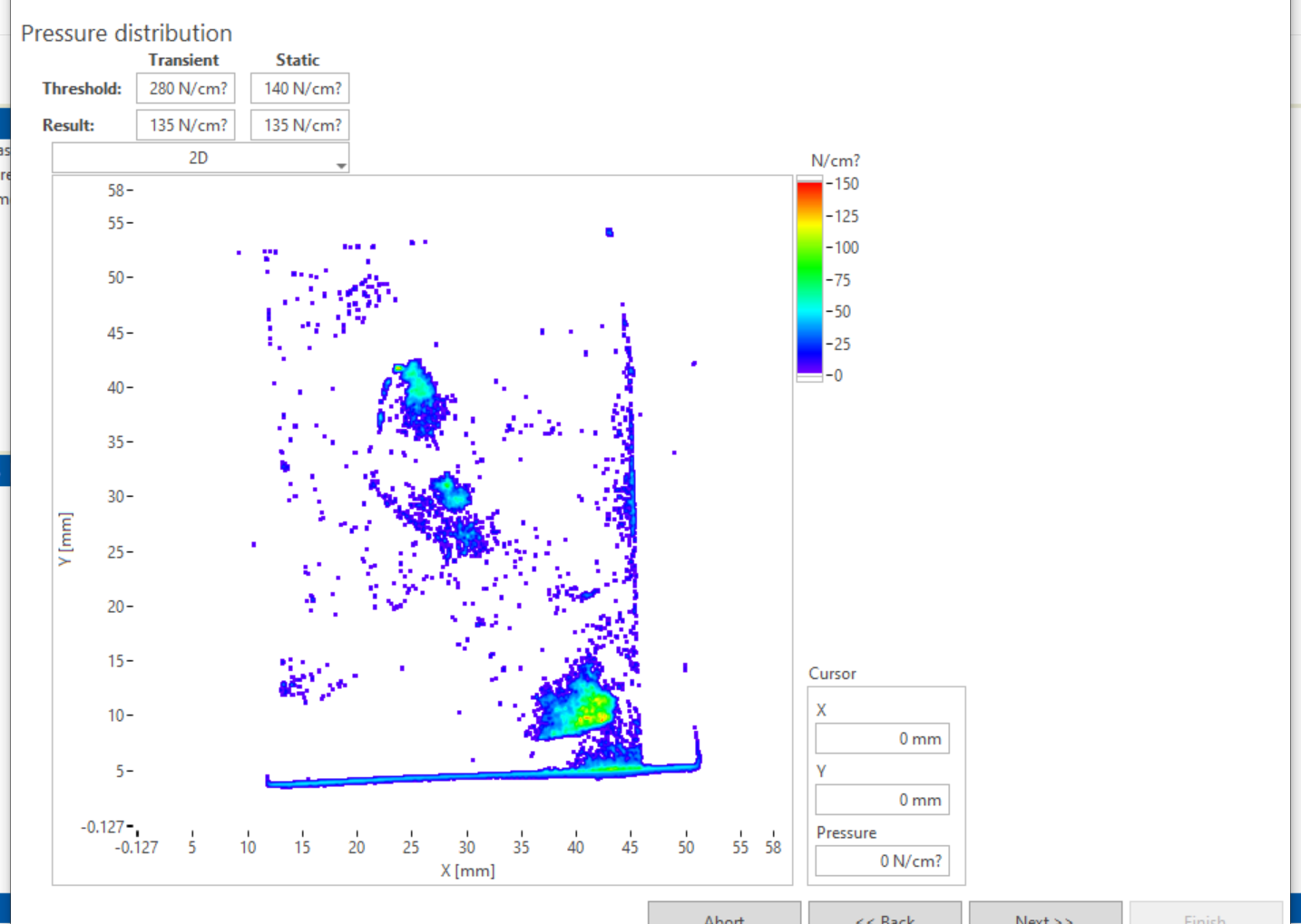 保证扫描成功后(扫描参考3.3.1),点击软件上方Coba Scan按钮,然后按下图顺序步骤,从文件中选择刚才扫描好的图片,根据需求选择标定区域(本例选择Rectangle区域)。最后可以得到压力与压力分布的图像,不同颜色代表压强大小,可根据需求,将红框中2D切换为3D图像。