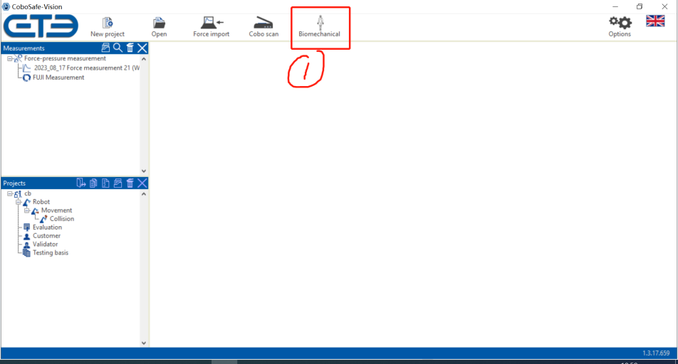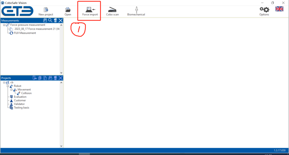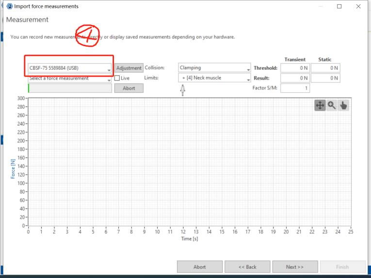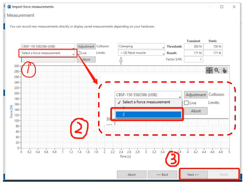 保证传感器与PC通讯成功后(通讯参考3.2),首先点击软件 ”Force Import”按钮,进入数据导入界面。然后点击 ”Select a force measurement” 下拉菜单,选择需要导出的数据,如刚才图14中的数据编号为 “ #ID:2 ”,那么此时以该数据为例,则选择红2框中的2。