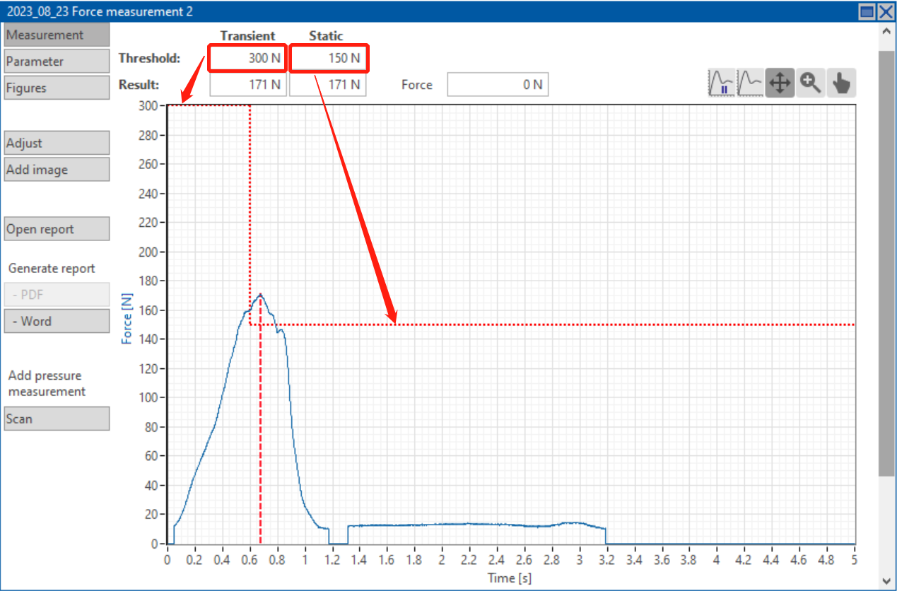 数据成功导入后如图17所示,红线为安全阈值,该数据来源于图5中所选择碰撞区域后所生成的标准(国际标准)。蓝线为实际力曲线。由图可知,该次碰撞在0.6至0.8s内,瞬态力与静态力皆不符合标准。