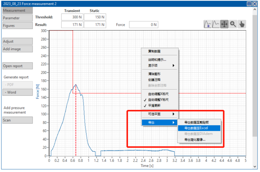 若想对碰撞过程的数据导出并分析,右击曲线,点击导出,导出数据至Excel即可。