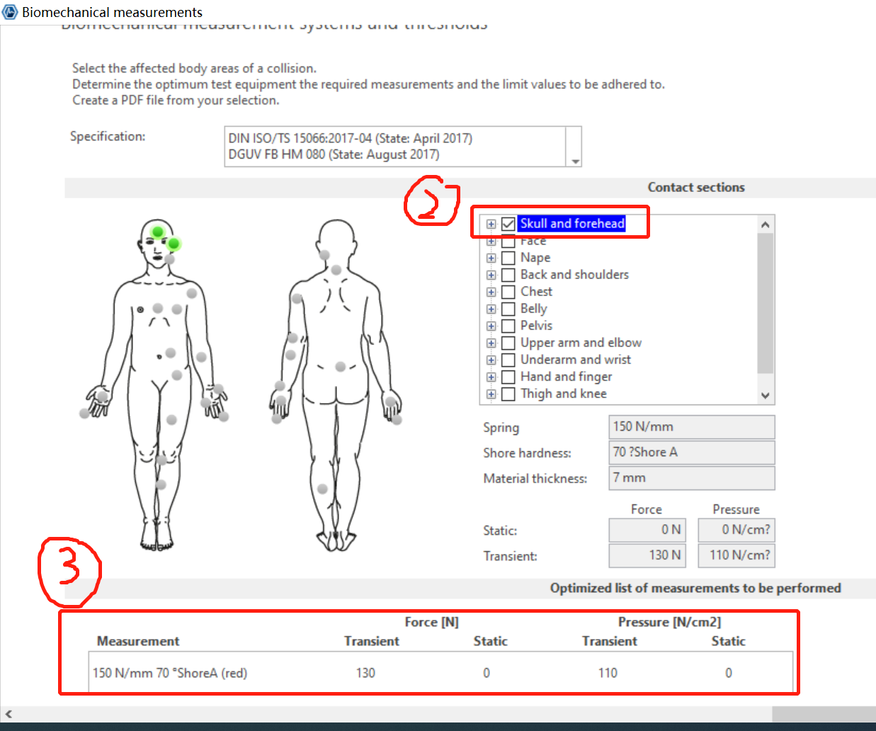 以碰撞人体安全测试为例,按图5所示点击Biomechanical按钮,进入Biomechanical measurements界面选择目标碰撞区域。本教程以碰撞Skull and forehead区域为例,红2框中选择Skull and forehead后,红3框中则会分别显示出该区域对应的传感器刚度系数(150N/mm),阻尼套类型(red),以及瞬态力,稳态力,压强的安全阈值(ISO国际标准)。