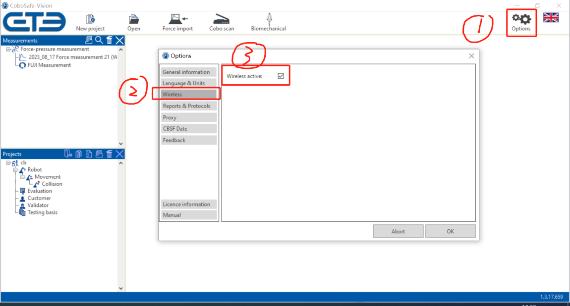 其次,在软件界面依次点击Options,Wireless按钮,确保Wireless active按钮打开,否则无法通信。然后按照图7步骤打开界面,在如下红框内选择对应型号的传感器。