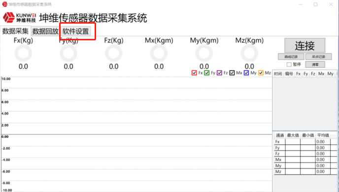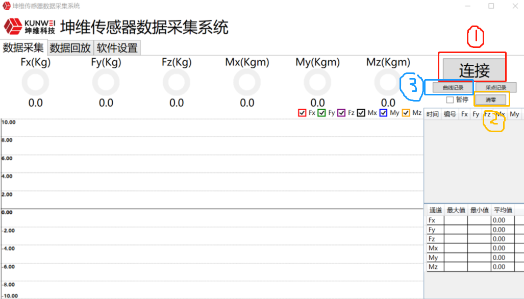 3)回到 “数据采集” 菜单,依次点击 “连接” , “清零” , “曲线记录” 按钮;