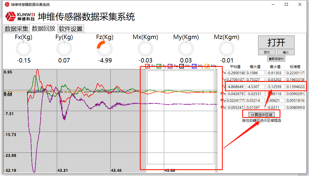 同理,在左侧力曲线图中,按住鼠标右键选择碰撞后稳定接触时的曲线段,如图所示,点击 “计算选中区域” 按钮,此时会得出该段曲线中的最大值,即稳态力为5.1255N;