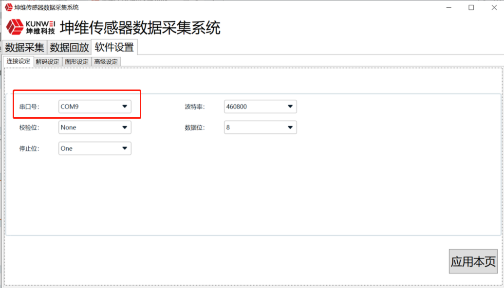 2)打开KWSenserLinker.exe软件,点击软件设置,选择对应的串口号,点击“应用本页”;