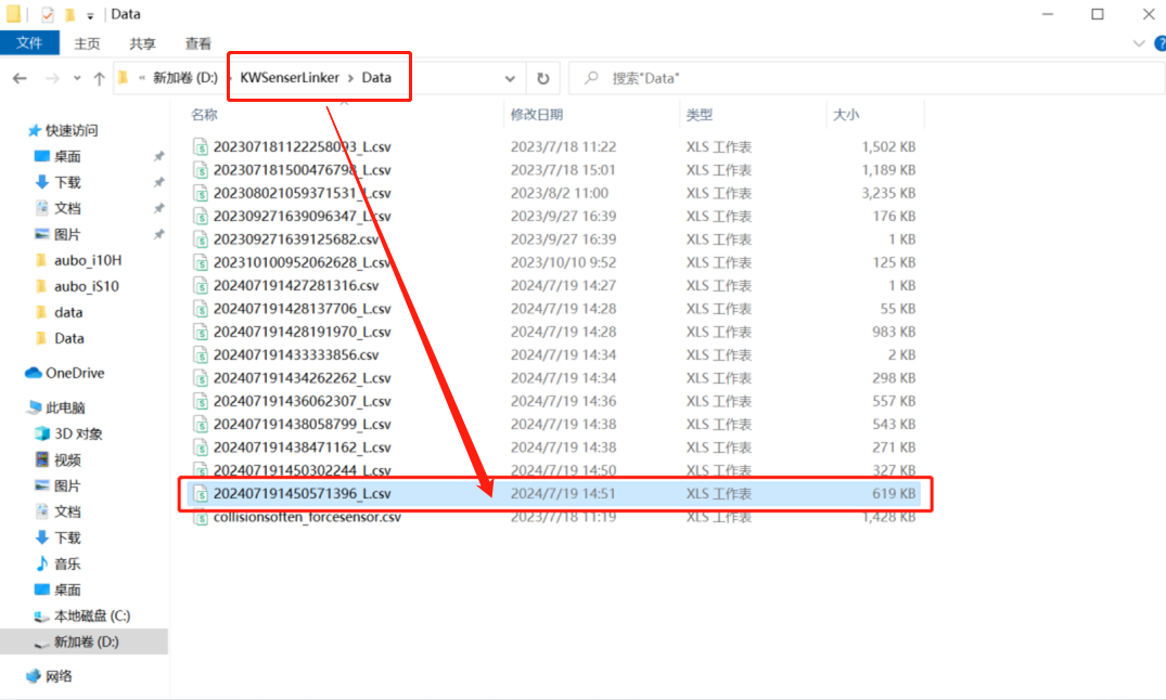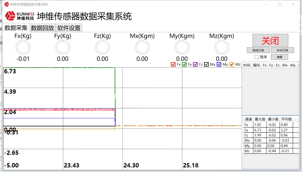 5)此时开启机械臂碰撞,图中曲线为碰撞时的数据曲线,右侧红色框中会显示碰撞过程各方向的最大值(取绝对值),根据撞击方向选择对应的最大值,碰撞结束后立即点击 “结束记录按钮”,碰撞数据会自动保存在KWSenserLinker/Data文件夹下;