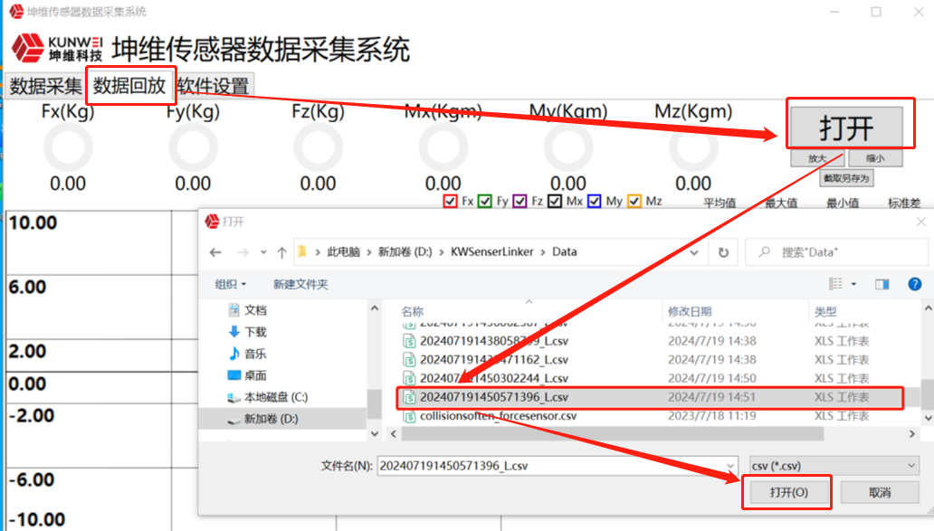 6)如需绘制碰撞曲线,则依次点击“数据回放”,“打开”,“刚才保存的数据”,“打开”;