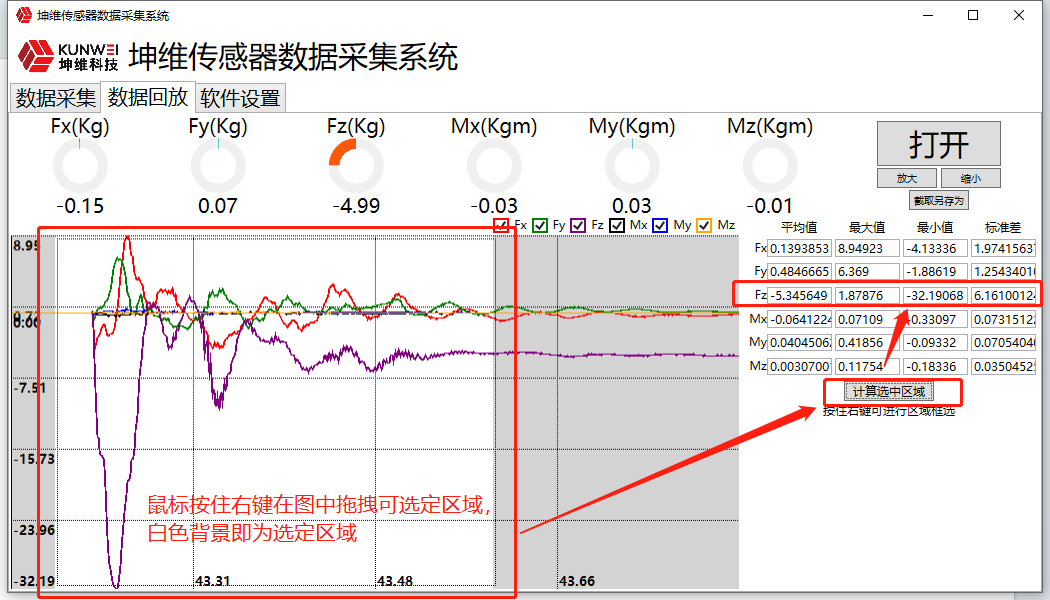 在左侧力曲线图中,按住鼠标右键选择碰撞瞬间时的曲线段,如图所示,点击 “计算选中区域” 按钮,此时会得出该段曲线中的最大值,即瞬态力为32.19N;